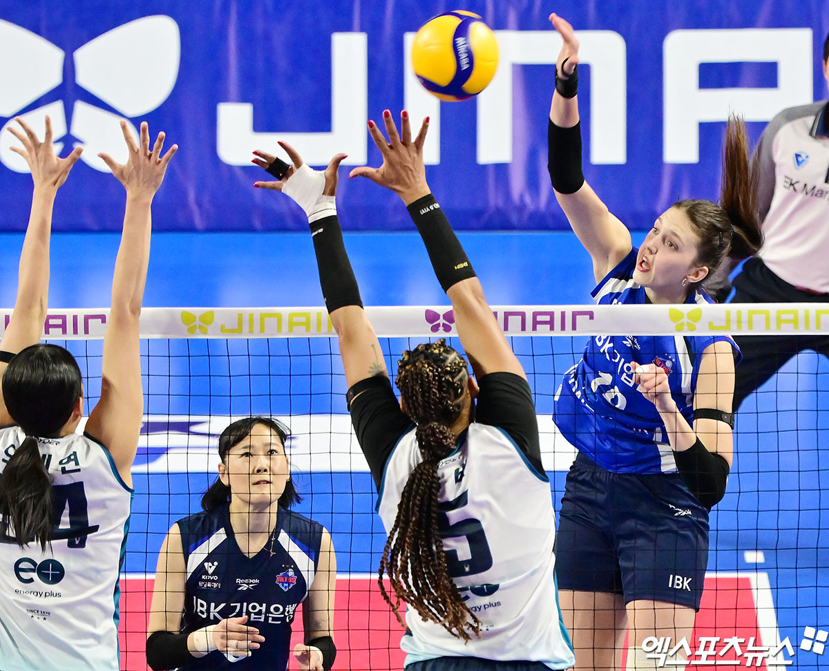 (엑스포츠뉴스 화성, 김한준 기자) 2일 오후 경기도 화성 종합실내체육관에 열린 '진에어 2025-2026 V-리그' IBK 기업은행과 GS칼텍스의 경기, 기업은행 빅토리아가 공격을 시도하고 있다.