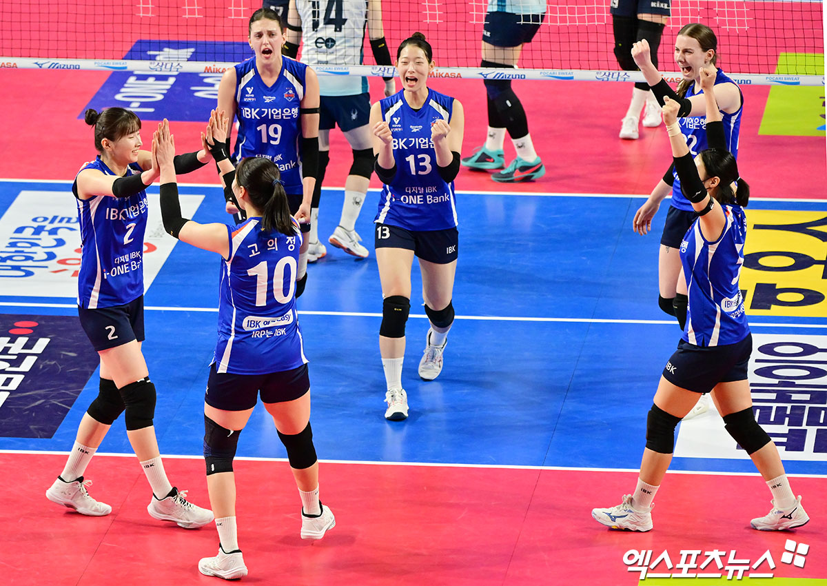 (엑스포츠뉴스 화성, 김한준 기자) 2일 오후 경기도 화성 종합실내체육관에 열린 '진에어 2025-2026 V-리그' IBK 기업은행과 GS칼텍스의 경기, 기업은행 선수들이 기뻐하고 있다.