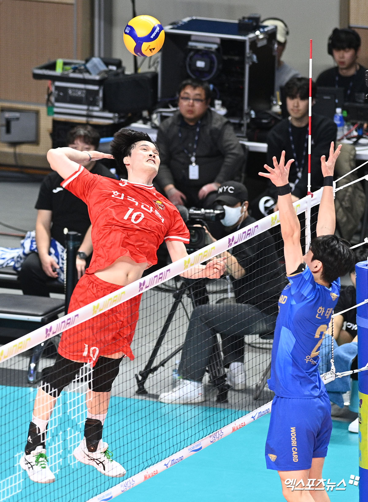 (엑스포츠뉴스 장충, 고아라 기자) 2일 오후 서울 장충체육관에서 열린 '진에어 2025-2026 V-리그' 우리카드와 한국전력의 경기, 한국전력 김정호가 공격을 시도하고 있다.