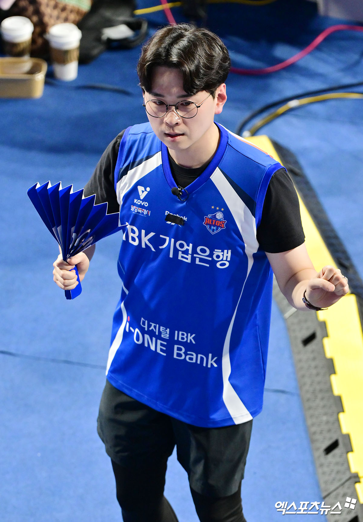 (엑스포츠뉴스 화성, 김한준 기자) 2일 오후 경기도 화성 종합실내체육관에 열린 '진에어 2025-2026 V-리그' IBK 기업은행과 GS칼텍스의 경기, KBSN 이호근 아나운서가 응원단장으로 변신해 열띤 응원을 선보이고 있다.