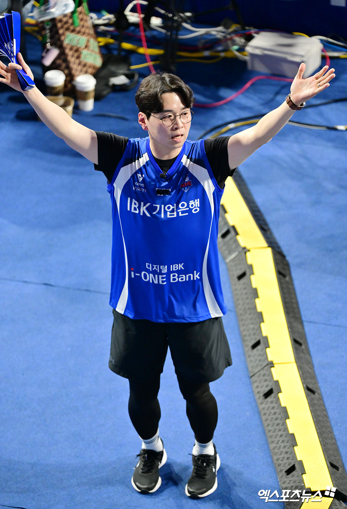 (엑스포츠뉴스 화성, 김한준 기자) 2일 오후 경기도 화성 종합실내체육관에 열린 '진에어 2025-2026 V-리그' IBK 기업은행과 GS칼텍스의 경기, KBSN 이호근 아나운서가 응원단장으로 변신해 열띤 응원을 선보이고 있다.