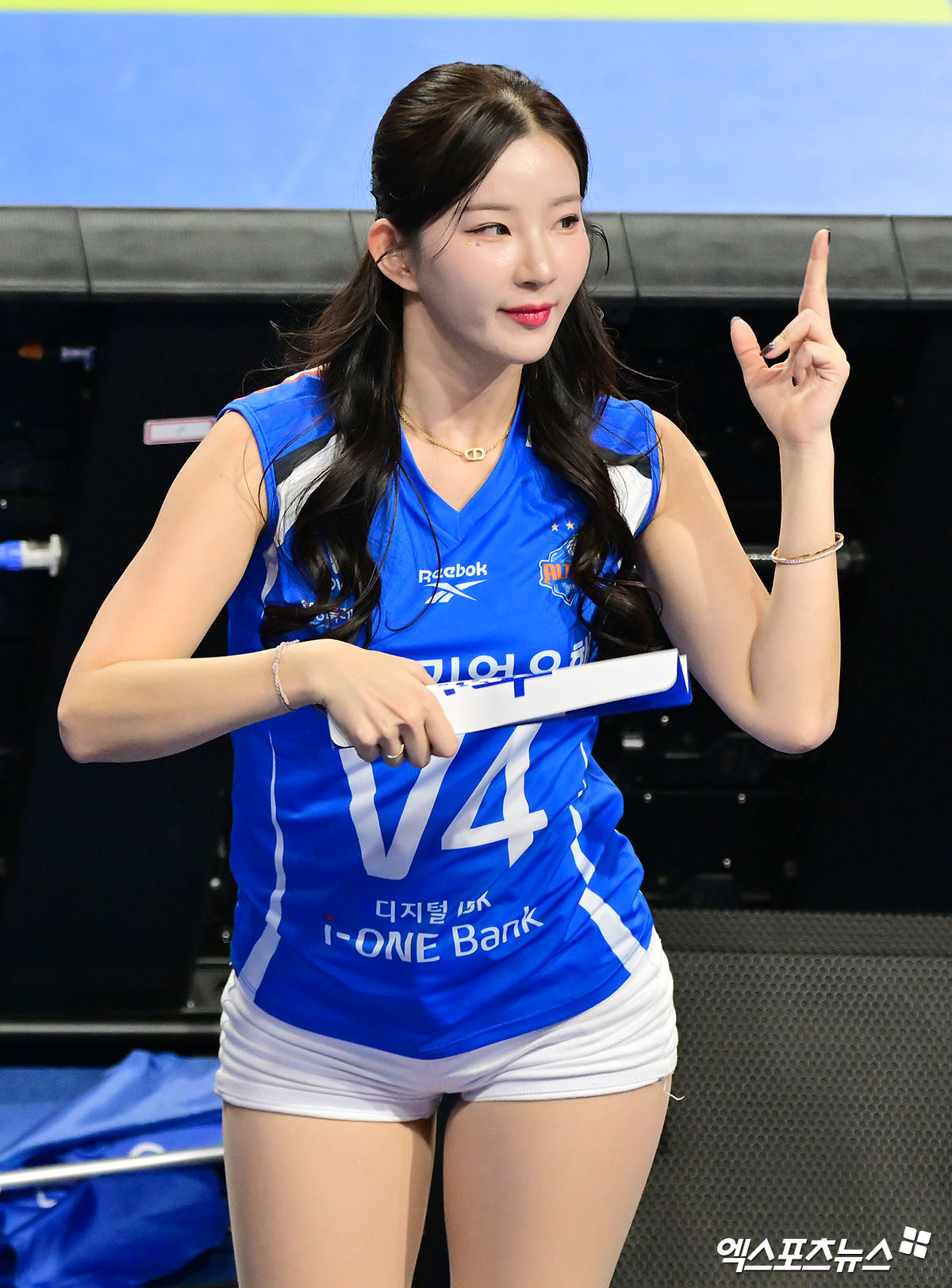 (엑스포츠뉴스 화성, 김한준 기자) 2일 오후 경기도 화성 종합실내체육관에 열린 '진에어 2025-2026 V-리그' IBK 기업은행과 GS칼텍스의 경기, 김진아 치어리더가 열띤 응원을 선보이고 있다.