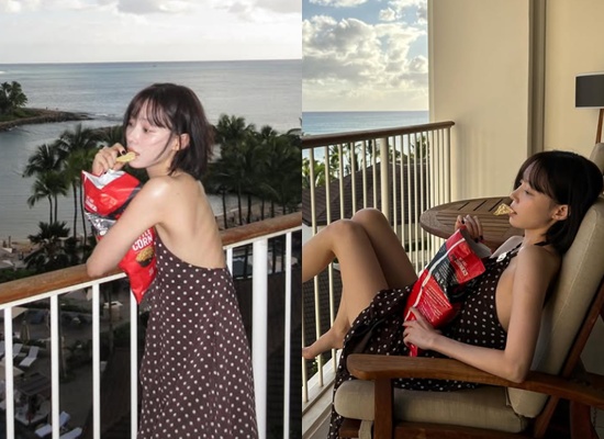 공개된 사진에는 윈터가 휴양지에서 여유로운 시간을 보내고 있는 모습이 담겼다. 바다를 배경으로 발코니에 선 윈터는 등 부분이 파인 도트 원피스를 입고 과자를 먹고 있는 모습. 군살 없는 가녀린 체형이 도드라지며 슬림한 실루엣이 눈길을 끌었다.