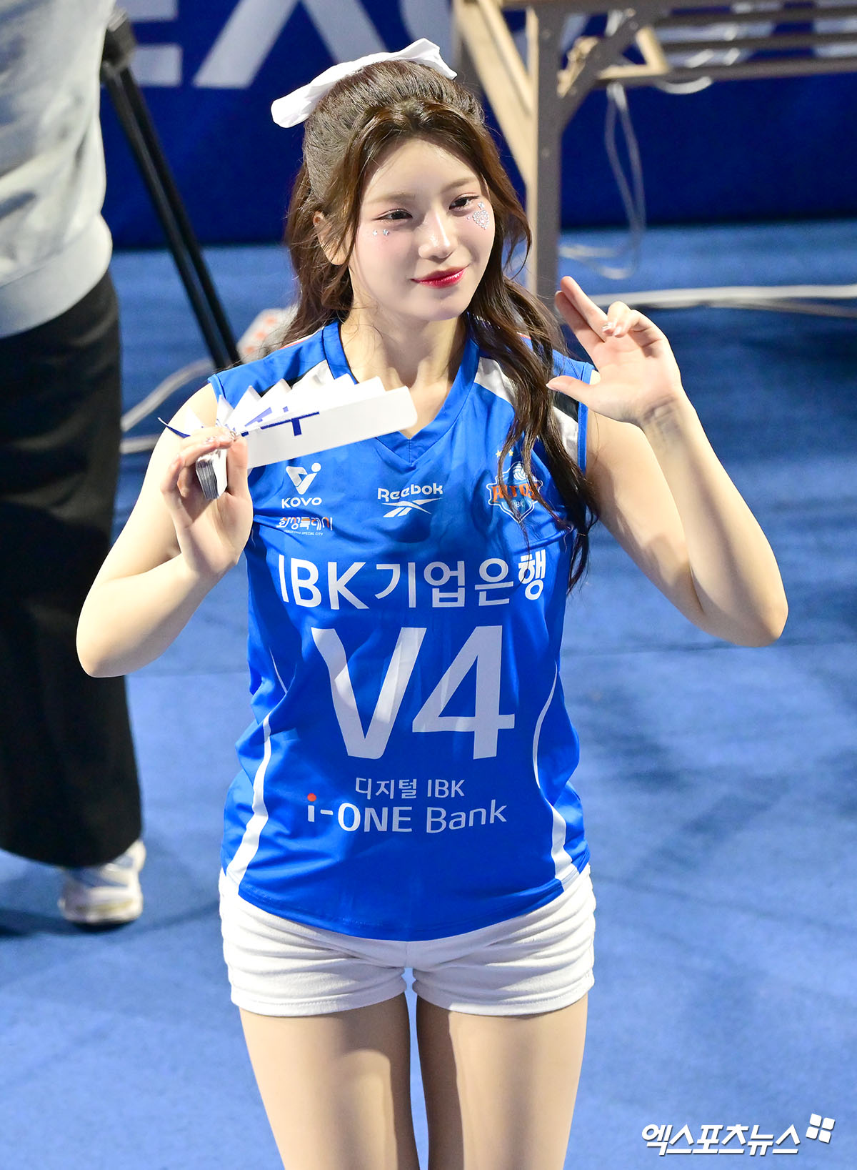 IBK기업은행 유니폼을 입고 코트에 등장한 그는 경쾌한 동작과 안정적인 동선, 표정 연기까지 더해진 응원으로 경기 분위기를 끌어올렸다.