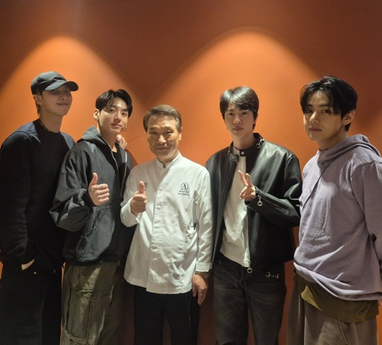 공개된 사진에는 후 셰프가 방탄소년단 멤버 RM, 정국, 진, 뷔와 만나 인증샷을 남기고 있는 모습이 담겼다. 후 셰프는 자신의 레스토랑을 찾은 이들과 나란히 서 셰프복을 입고 센터에 자리하고 있어 눈길을 끈다.