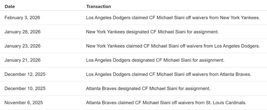 하지만 다저스의 시아니 영입에 대해 미국 현지의 저명 기자들도 주목해 자신의 SNS에 그 내용을 올리고 있다. 특별할 것 없는 백업 외야수의 이적에 관심을 가지는 건, 불과 2달 사이에 4번이나 타의에 의해 팀을 옮겨다녔기 때문이다.
