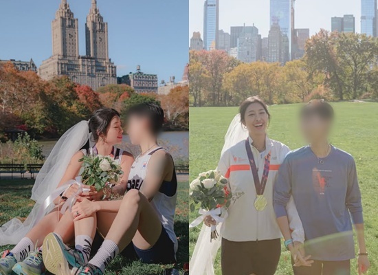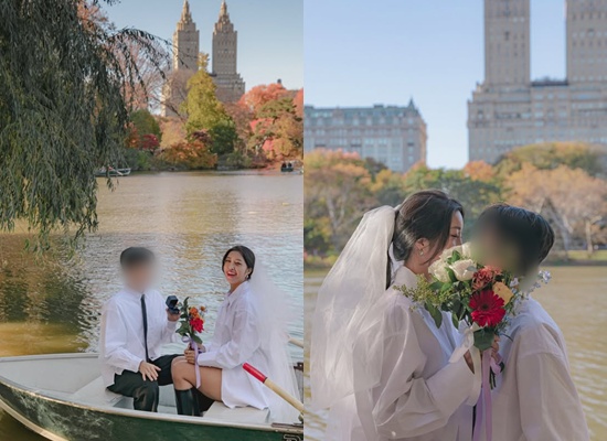 공개된 사진은 미국 뉴욕에서 촬영한 웨딩 화보로, 두 사람은 서로를 바라보거나 입을 맞추는 등 다정한 포즈들로 기쁘게 인증샷을 남겼다.