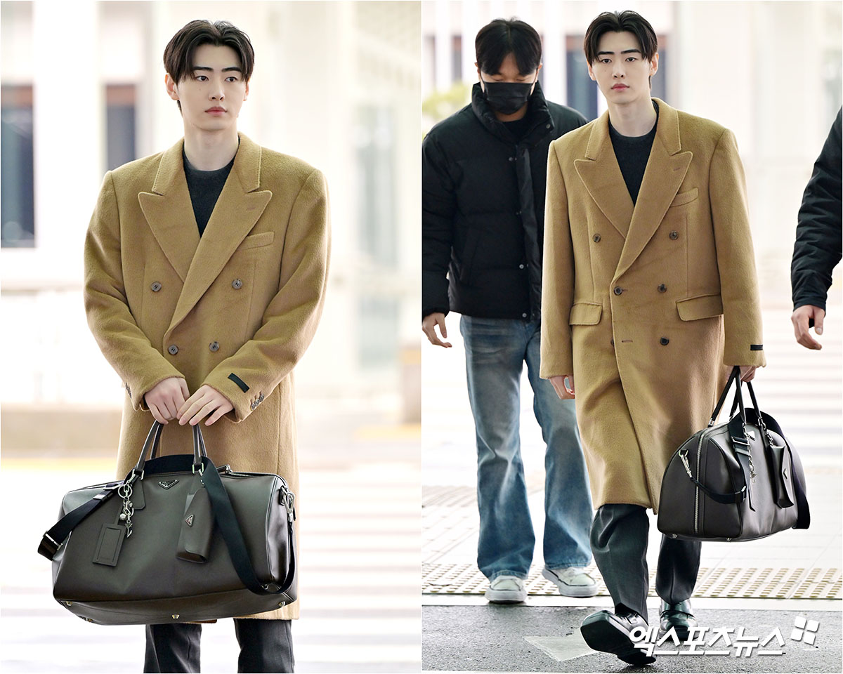 엔하이픈 성훈은 클래식한 무드의 공항패션으로 차분하면서도 세련된 분위기를 완성했다. 전체 스타일링의 중심은 카멜 컬러의 더블 코트. 무릎 아래로 떨어지는 기장과 구조적인 실루엣이 단정한 인상을 주며, 공항패션 특유의 여유로움과 포멀함을 동시에 잡았다.