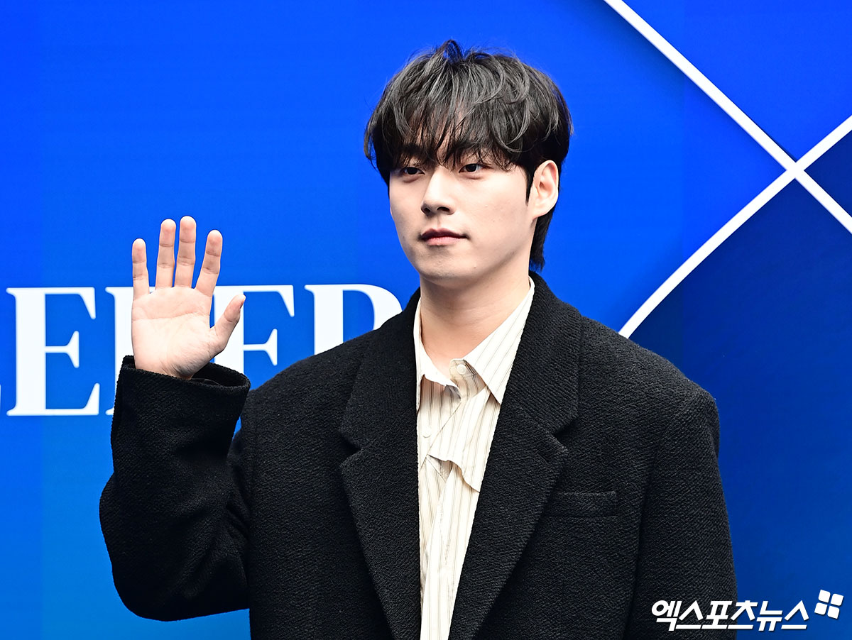 이날 페노메논시퍼 컬렉션 쇼에 참석한 가수 겸 배우 윤재찬이 포토타임을 갖고 있다.