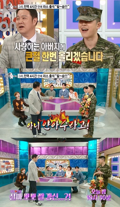 방송에 앞서 공개된 영상에서 그리는 스튜디오에 등장하자마자 우렁차게 해병대식 전역 신고를 해 모두의 시선을 사로잡는다. 특히 김구라는 아들의 전역 신고에 눈가가 촉촉해진다. 이들의 모습을 보던 조혜련이 눈물을 흘리며 오열하자, MC 김구라는 “내가 울어야지, 왜 울어?!”라며 괜히 호통을 쳐 웃음을 자아낸다.