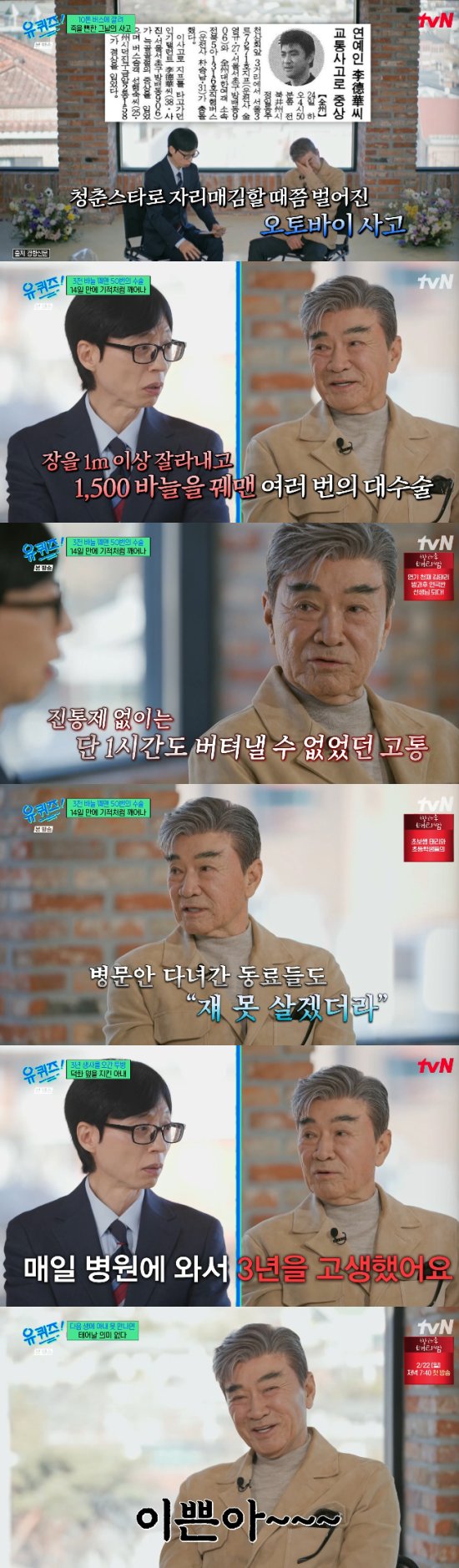 (엑스포츠뉴스 오수정 기자) '유퀴즈'에서 이덕화가 죽음의 문턱까지 갔던 오토바이 사고를 회상했다.