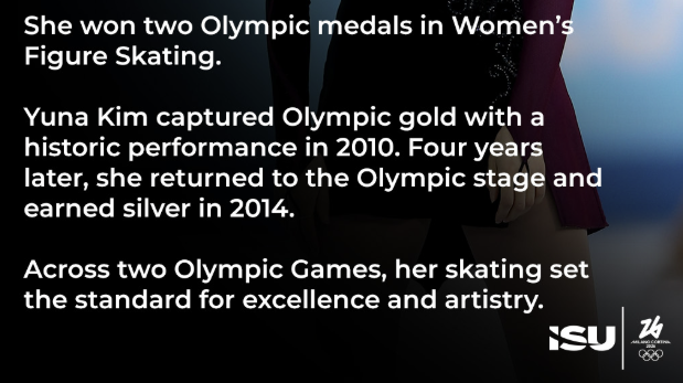 ISU는 2010 밴쿠버 올림픽 금메달, 2014 소치 올림픽 은메달 등 김연아가 따낸 업적 소개도 곁들였다.
