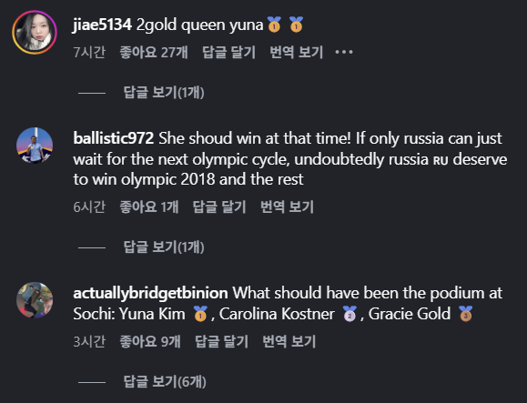 금메달 이모지를 2개 연달아 게시하는 댓글이나 "2 GOLD"라고 적은 댓글들이 홍수를 이루고 있다. "2014년엔 금메달이 맞아", "의심할 여지 없는 2연패"라는 문구도 있었다.
