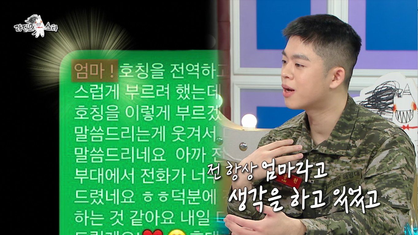 그는 "(호칭이) 자연스럽게 넘어가는 건 줄 알았다. 그런데 '이제부터 엄마라고 부를게요' 말하는 건 마치 고백하는 것 같지 않나. 이미 엄마라고 생각하고 있고 부를 준비는 돼 있는데 이제부터 부르겠다는 말이 안 떨어졌다. 그러다 전역 전 날이 됐는데 아직까지 엄마라고 부르지 못하게 된 거다. (마음을 먹고) 전날 전화를 드렸는데 안 받으셨다. 핸드폰을 9시에 내야 해서 55분까지 기다리다가 문자를 보냈다"고 고백했다.