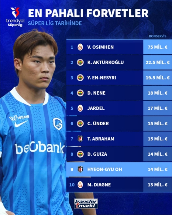 글로벌 이적시장 전문 사이트 '트란스퍼마크트' 튀르키예 계정은 5일(한국시간) 이적을 확정한 오현규의 이적료가 쉬페르리그 전체 9위라고 알렸다.