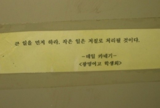 최근 한 온라인 커뮤니티 게시판에 '화장실 최고 명언'이라는 제목의 사진이 게재돼 네티즌들에게 웃음을 주고 있다. 출처가 '광명여고 학생회'라고 적힌 메모에는 "큰일을 먼저 하라. 작은 일은 저절로 처리될 것이다 - 데일 카네기"라는 카네기의 명언구가 적혀 있다.