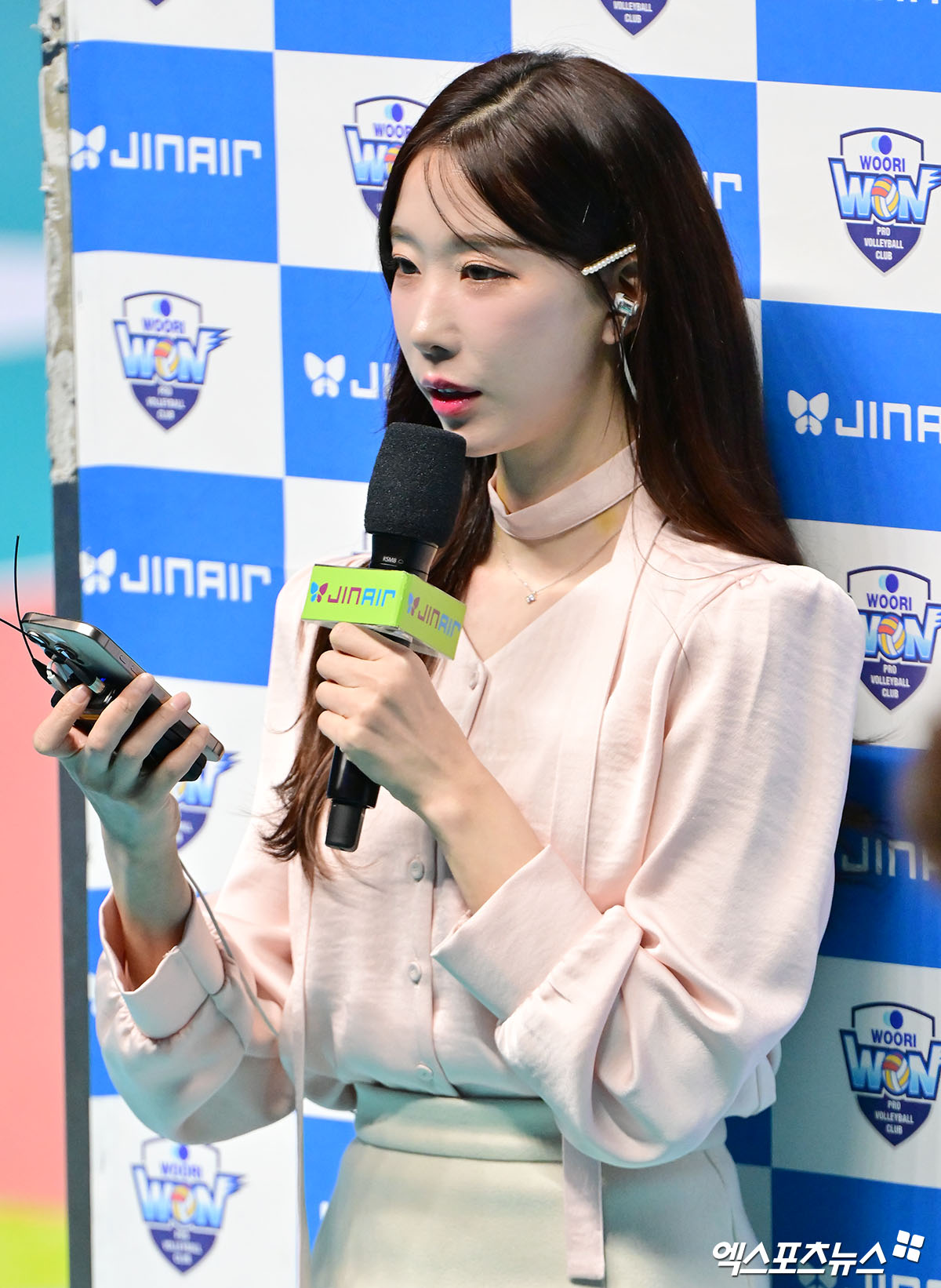 (엑스포츠뉴스 장충, 김한준 기자) 6일 오후 서울 장충체육관에서 열린 '진에어 2025-2026 V-리그' 우리카드와 현대캐피탈의 경기, 진달래 아나운서가 감독 인터뷰를 진행하고 있다.