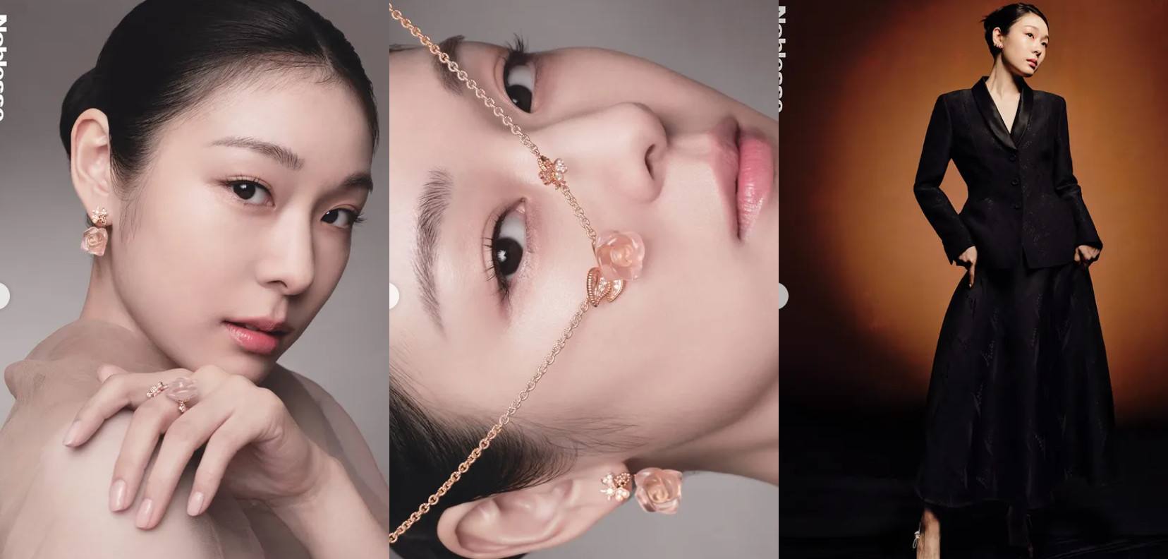 특히 귀 옆과 얼굴 라인을 따라 장식된 로즈 디자인 액세서리는 김연아의 단아한 이미지와 어우러지며 클래식하면서도 화사한 인상을 남겼다. 손에 든 디올 프레스티지 세럼 역시 사진마다 자연스럽게 녹아들며 전체 콘셉트를 완성했다.