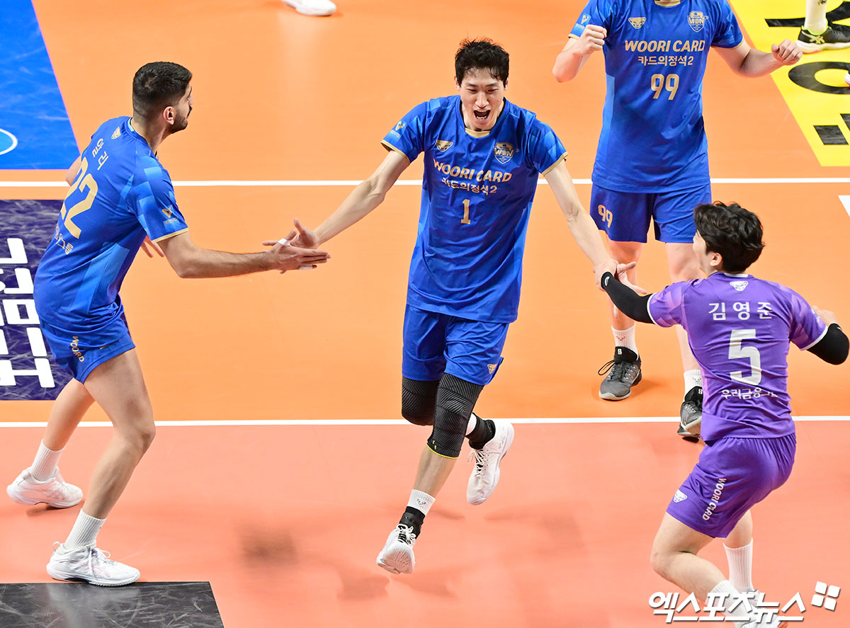 (엑스포츠뉴스 장충, 김한준 기자) 6일 오후 서울 장충체육관에서 열린 '진에어 2025-2026 V-리그' 우리카드와 현대캐피탈의 경기, 우리카드 박진우가 블로킹 성공 후 기뻐하고 있다.