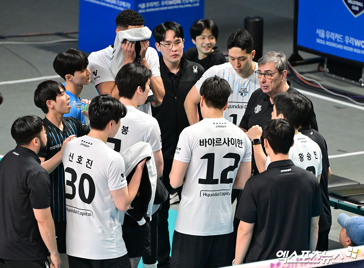 (엑스포츠뉴스 장충, 김한준 기자) 6일 오후 서울 장충체육관에서 열린 '진에어 2025-2026 V-리그' 우리카드와 현대캐피탈의 경기, 현대캐피탈 필립 블랑 감독이 작전타임을 갖고 있다.