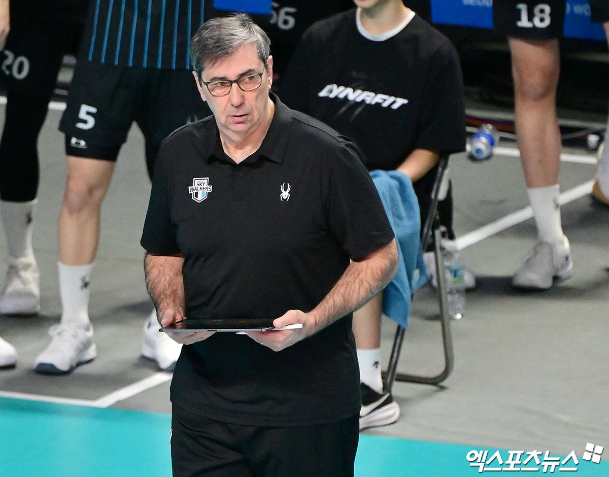 (엑스포츠뉴스 장충, 김한준 기자) 6일 오후 서울 장충체육관에서 열린 '진에어 2025-2026 V-리그' 우리카드와 현대캐피탈의 경기, 현대캐피탈 필립 블랑 감독이 경기를 지켜보고 있다.