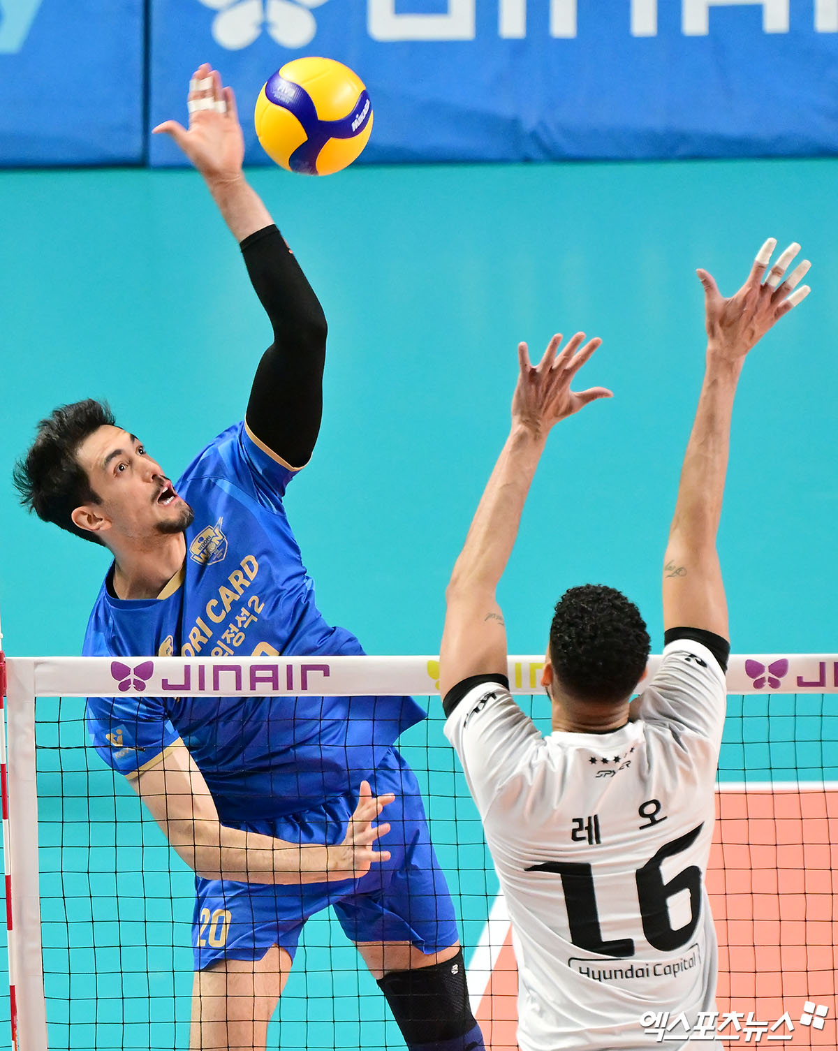 (엑스포츠뉴스 장충, 김한준 기자) 6일 오후 서울 장충체육관에서 열린 '진에어 2025-2026 V-리그' 우리카드와 현대캐피탈의 경기, 우리카드 아라우조가 공격을 시도하고 있다.