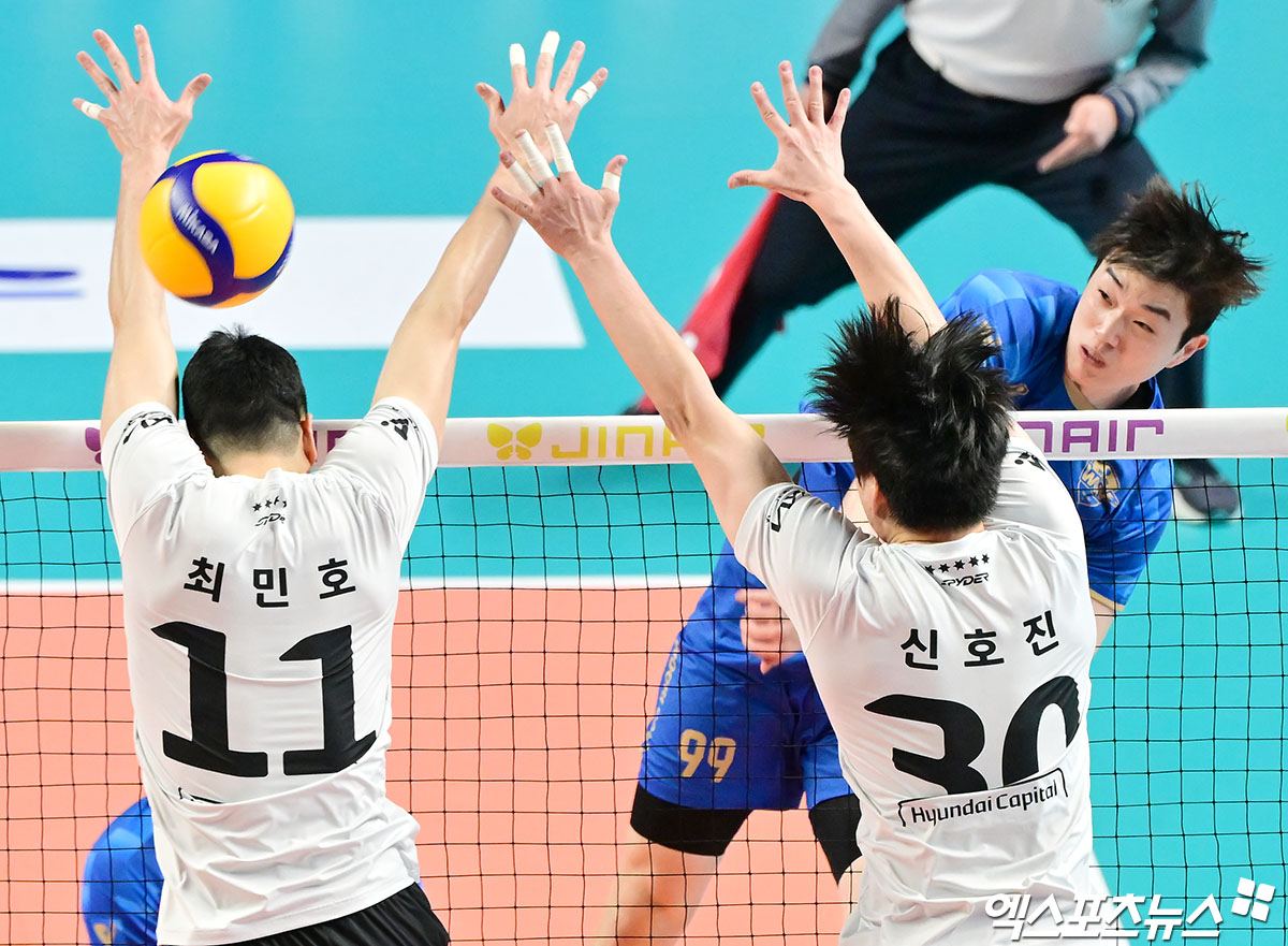 (엑스포츠뉴스 장충, 김한준 기자) 6일 오후 서울 장충체육관에서 열린 '진에어 2025-2026 V-리그' 우리카드와 현대캐피탈의 경기, 우리카드 김지한이 공격을 시도하고 있다.