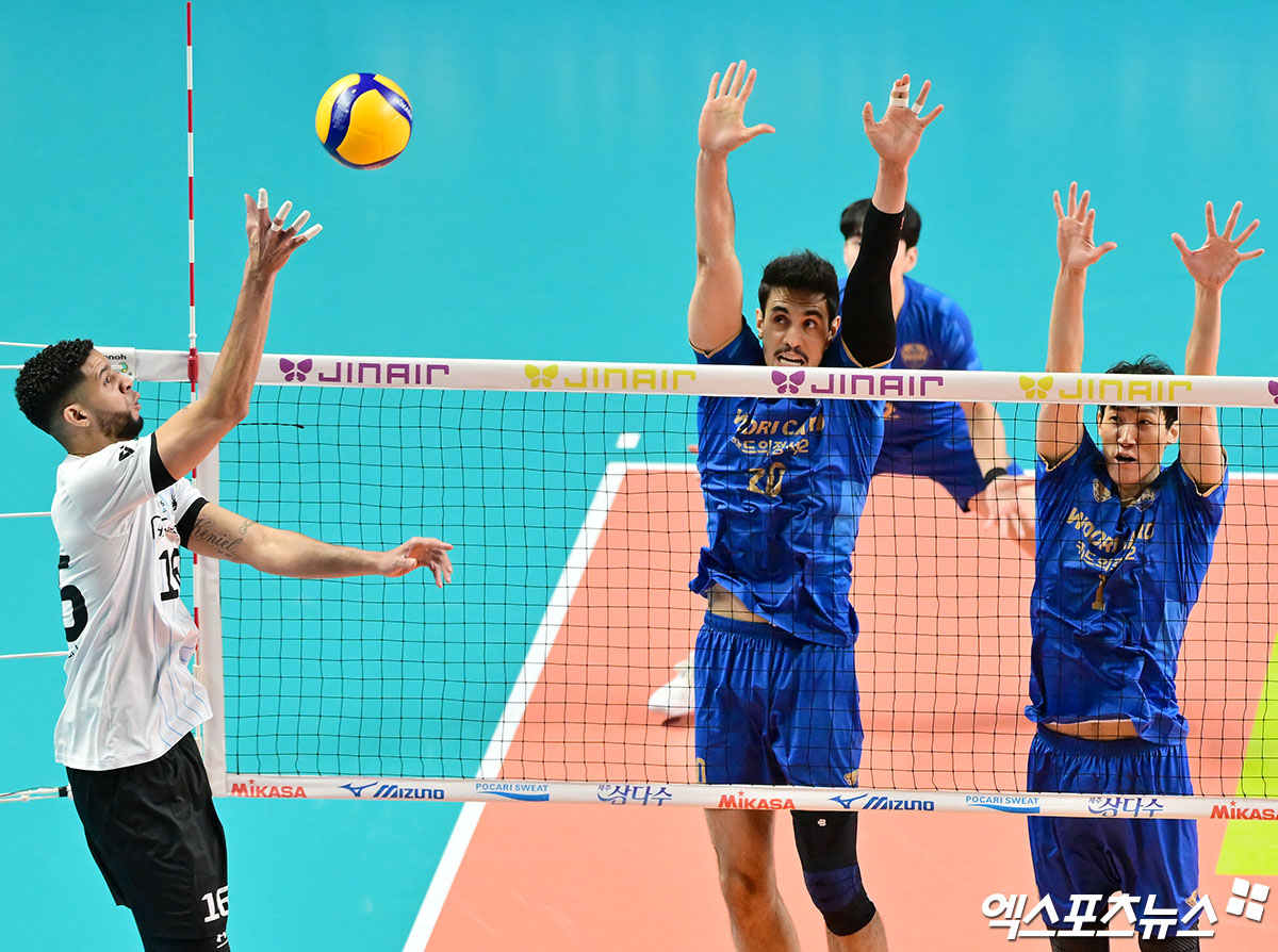 (엑스포츠뉴스 장충, 김한준 기자) 6일 오후 서울 장충체육관에서 열린 '진에어 2025-2026 V-리그' 우리카드와 현대캐피탈의 경기, 현대캐피탈 레오가 공격을 시도하고 있다.