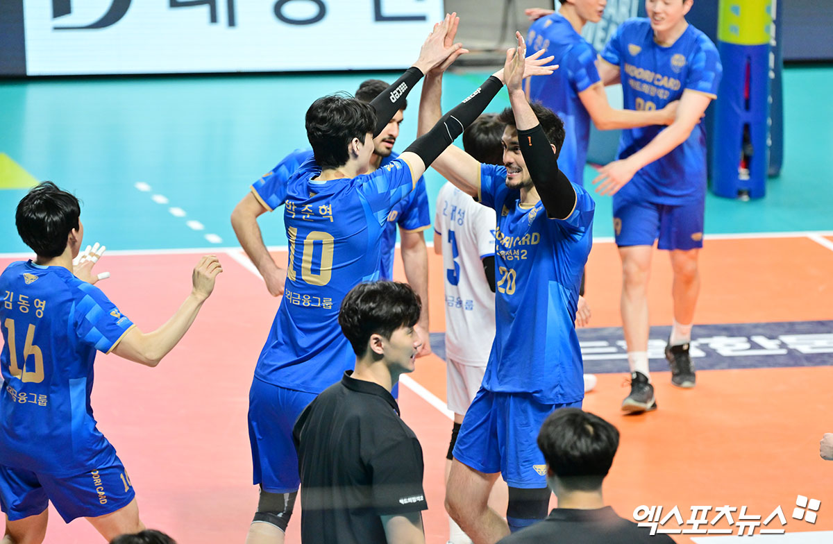 이날 경기에서 승리한 우리카드 선수들이 기뻐하고 있다.