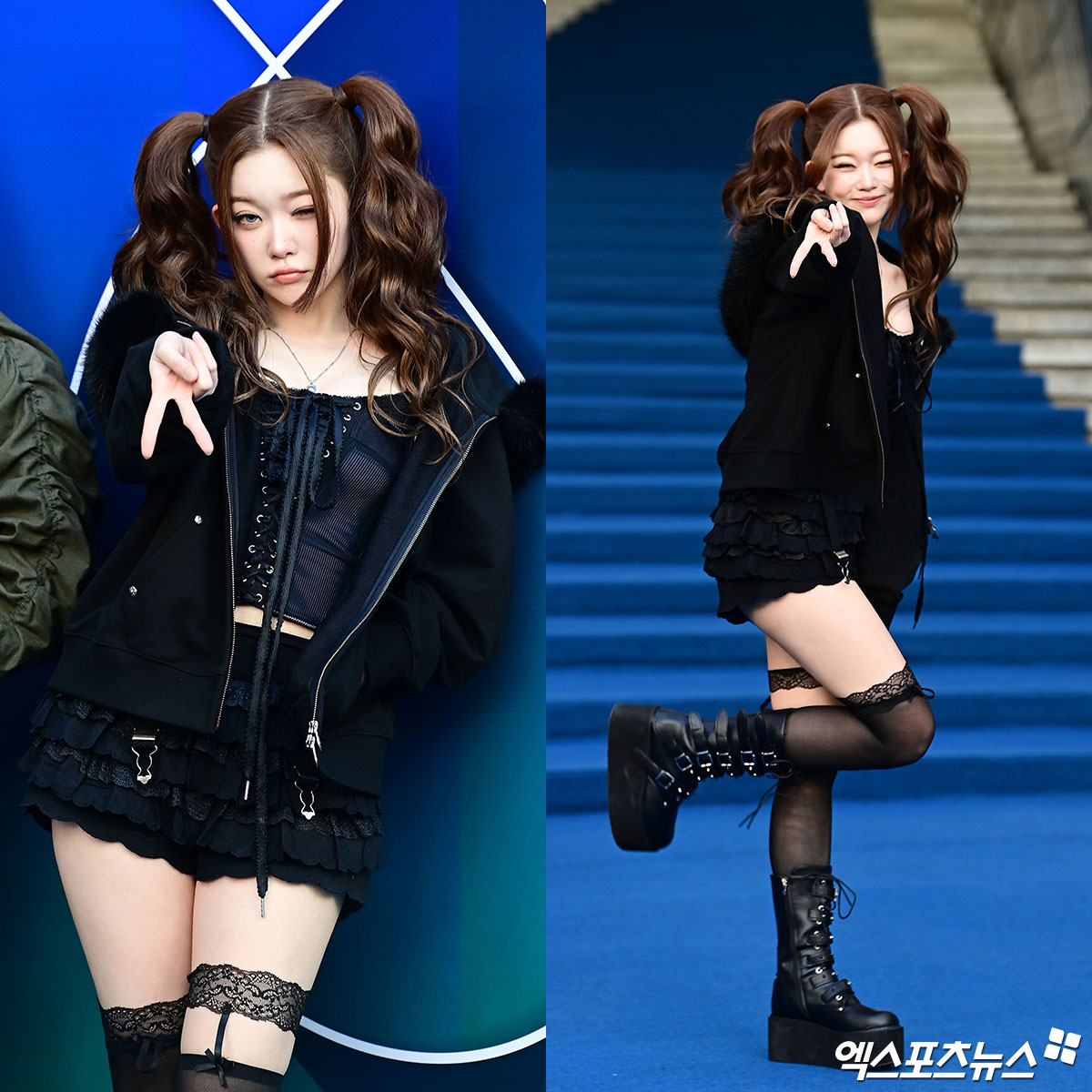 높게 묶은 양갈래 웨이브 헤어가 다크한 의상 컨셉과 대비되어 독특한 분위기를 만들었고, 언더 속눈썹을 강조한 메이크업이 인형같은 미모를 더욱 돋보이게 했다.