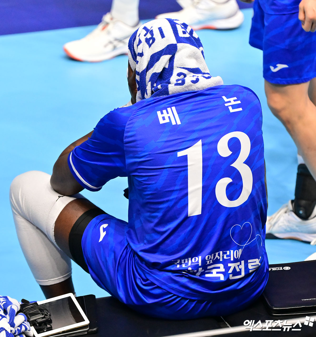 (엑스포츠뉴스 인천, 김한준 기자) 7일 오후 인천 계양체육관에서 열린 '진에어 2025-2026 V-리그' 대한항공과 한국전력의 경기, 한국전력 베논이 휴식을 취하고 있다.