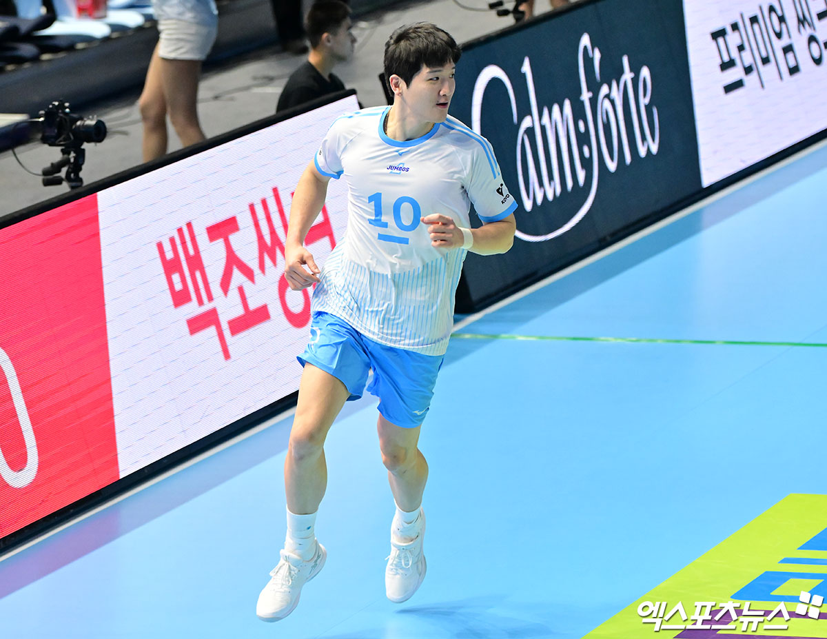 (엑스포츠뉴스 인천, 김한준 기자) 7일 오후 인천 계양체육관에서 열린 '진에어 2025-2026 V-리그' 대한항공과 한국전력의 경기, 대한항공 정지석이 블로킹 성공 후 산책 세리머니를 하고 있다.