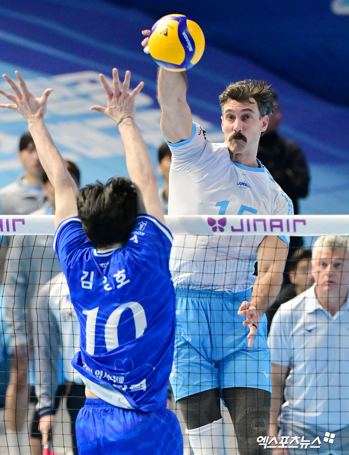(엑스포츠뉴스 인천, 김한준 기자) 7일 오후 인천 계양체육관에서 열린 '진에어 2025-2026 V-리그' 대한항공과 한국전력의 경기, 대한항공 러셀이 공격을 시도하고 있다.