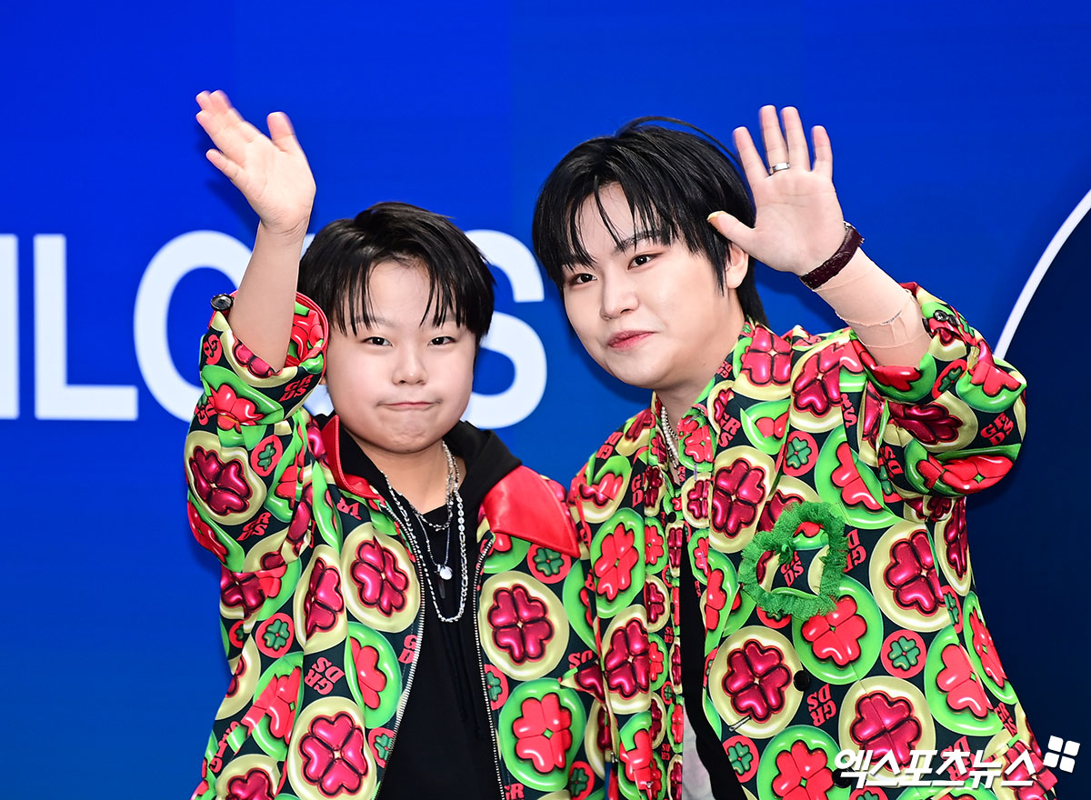 이날 그리디어스 쇼에 참석한 가수 황민호, 황민우 형제가 포토타임을 갖고 있다.