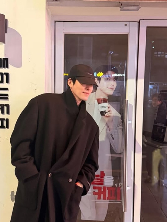 공개된 사진 속에는 김우빈이 광고 모델로 활동 중인 프랜차이즈 커피 전문점 매장 앞에서 촬영된 것으로, 매장 외벽에 걸린 자신의 광고 이미지 앞에 서 있는 모습이 담겼다.