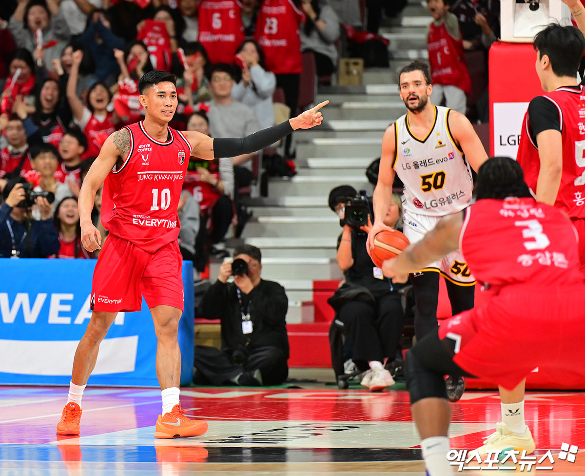 (엑스포츠뉴스 안양, 김한준 기자) 8일 오후 경기도 정관장 아레나에서 열린 2025-2026 LG전자 프로농구 안양 정관장과 창원 LG의 경기, 정관장 아반도가 덩크를 성공시킨 후 기뻐하고 있다.