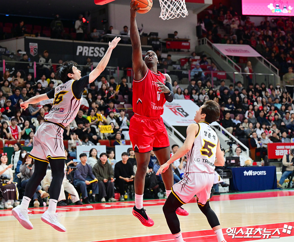 (엑스포츠뉴스 안양, 김한준 기자) 8일 오후 경기도 정관장 아레나에서 열린 2025-2026 LG전자 프로농구 안양 정관장과 창원 LG의 경기, 정관장 오브라이언트가 레이업을 시도하고 있다.