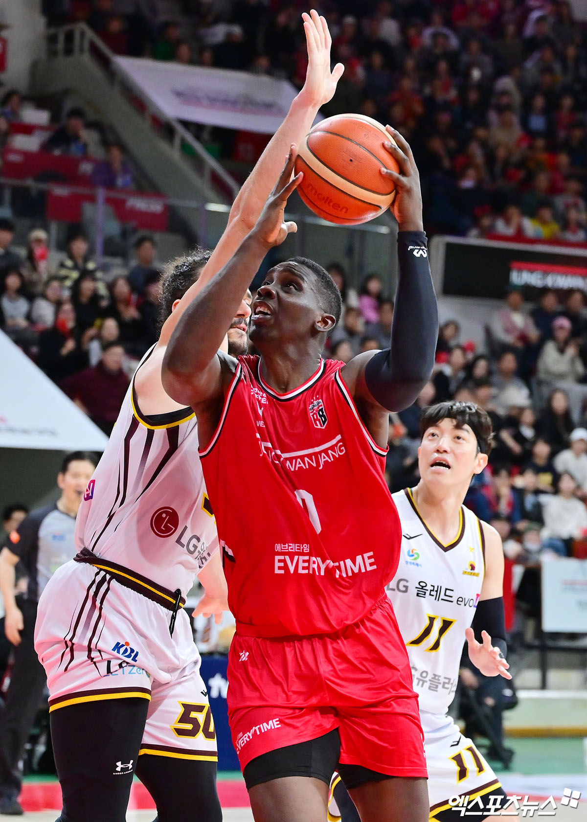 (엑스포츠뉴스 안양, 김한준 기자) 8일 오후 경기도 정관장 아레나에서 열린 2025-2026 LG전자 프로농구 안양 정관장과 창원 LG의 경기, 정관장 오브라이언트가 골밑슛을 시도하고 있다.