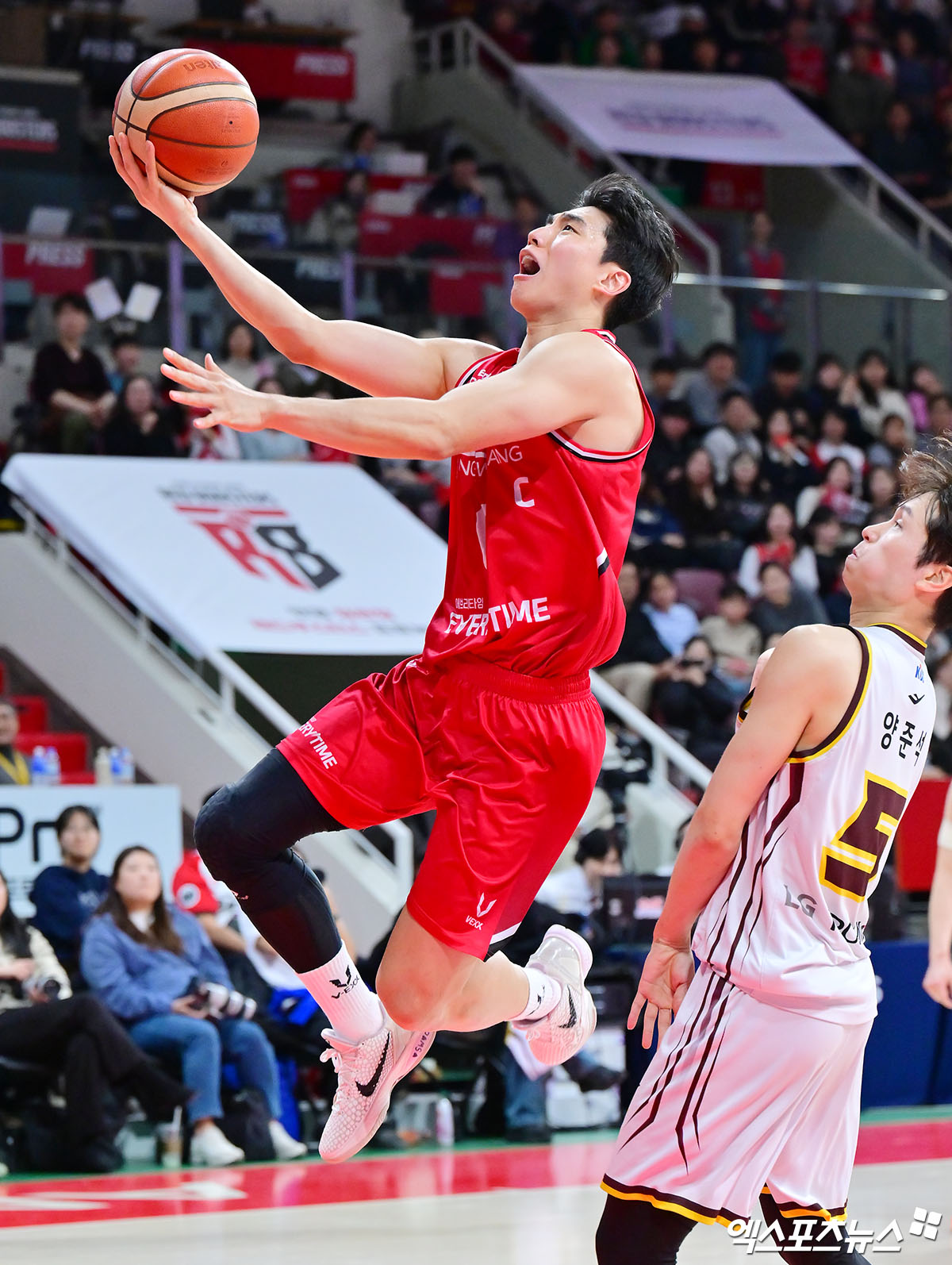 (엑스포츠뉴스 안양, 김한준 기자) 8일 오후 경기도 정관장 아레나에서 열린 2025-2026 LG전자 프로농구 안양 정관장과 창원 LG의 경기, 정관장 박지훈이 레이업을 시도하고 있다.