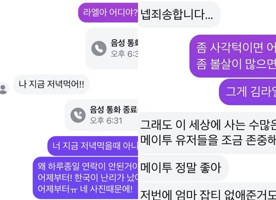 그러나 "좀 사각턱이면 어떠니. 좀 볼살이 많으면 어떠니. 그게 김라엘인데"라는 잔소리가 이어지자, "그래도 이 세상에 사는 수많은 메이투 유저들을 조금 존중해줘. 메이투 정말 좋아. 저번에 엄마 잡티 없애준 거도"라고 말해 또 웃음을 줬다.