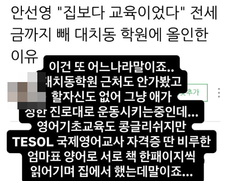 이와 관련해 안선영은 "이건 또 어느나라 말이죠. 대치동 학원 근처도 안 가봤고 할 자신도 없어 그냥 애가 정한 진로대로 운동 시키는 중인데.. 영어 기초 교육도 콩글리쉬지만 TESOL 국제영어교사 자격증 딴 비루한 엄마표 영어로 서로 책 한 페이지씩 읽어가며 집에서 했는데 말이죠"라는 해명을 전해 눈길을 끌었다.