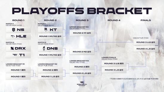 2026 LCK CL 킥오프 플레이오프는 9일(월)부터 WDG 스튜디오 홍대(서울 마포)에서 오프라인으로 진행된다. 오후 2시에는 농심 레드포스와 한화생명e스포츠가, 오후 5시에는 디알엑스와 티원 이스포츠 아카데미가 맞대결을 펼친다. 플레이오프의 대미를 장식할 결승전은 오는 3월 3일(화) 열린다.