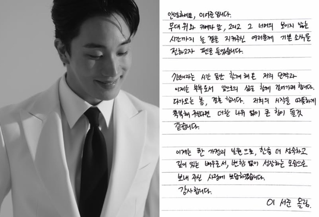 9일 배우 이서준은 자신의 계정을 통해 손편지와 함께 직접 결혼 소식을 알렸다.
