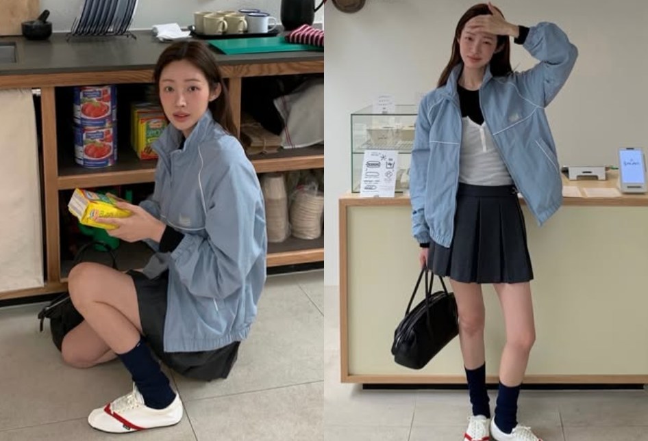 사진 속 차정원은 하늘색 바람막이에 미니스커트, 니삭스와 운동화를 매치해 스타일리시하면서도 편안한 패션을 선보였다.