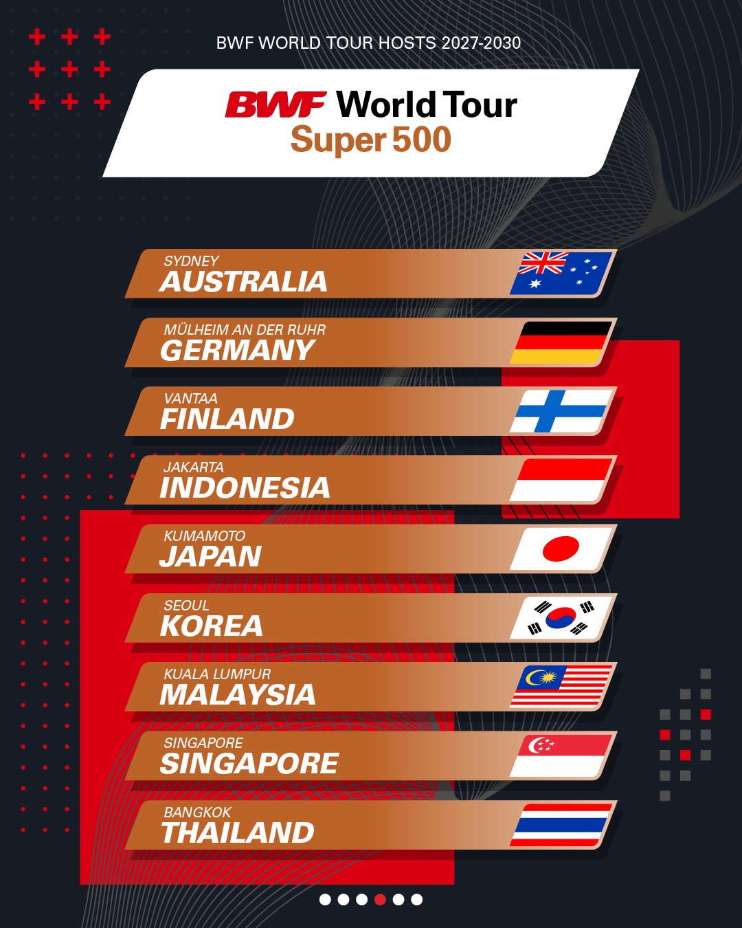 BWF는 9일(한국시간) 공식 채널을 통해 2027년부터 2030년까지 4년간 열릴 월드투어 시리즈의 개최국 명단을 확정해 발표했다.