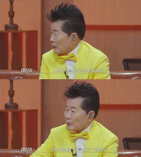 대표곡 '옥경이'가 있을 정도로 태진아는 아내에 대한 사랑이 각별하기로 유명하다. 2024년 방송된 MBN '언포게터블 듀엣'에서는 "한번은 아내가 자다가 화장실을 가고 싶어서 나를 깨웠는데, 내가 일어나지 못한 적이 있다. 그때 아내가 혼자 화장실을 다녀오다가 넘어져서 팔이 빠진 적도 있고, 오른쪽 무릎을 다친 적도 있다. 그래서 지금은 끈으로 내 오른쪽 손을 묶고, 반대편 줄은 아내 손목에 묶고 잔다. 가끔은 아내가 줄을 당겨도 내가 피곤해서 못 일어날 때가 있다. 그래서 이불 밑에 종이를 깔아뒀다. 아내가 조금만 움직여도 바스락거려서 내가 일어나게 된다. 그 이후로는 넘어진 적이 없다"며 "그럼에도 지금 살아있음에 감사하다"고 말했다.