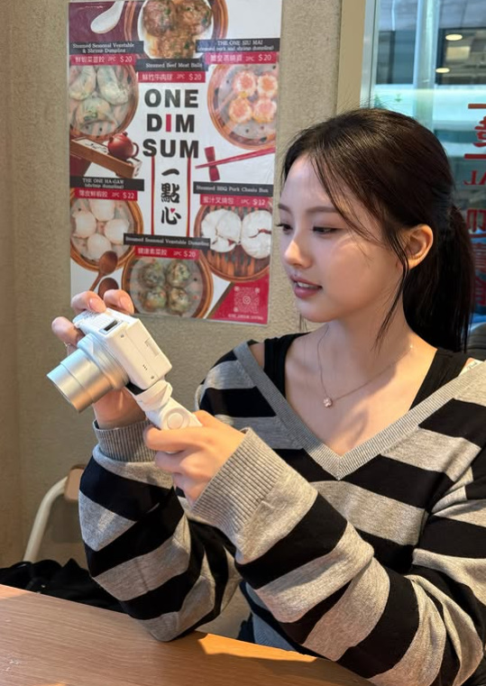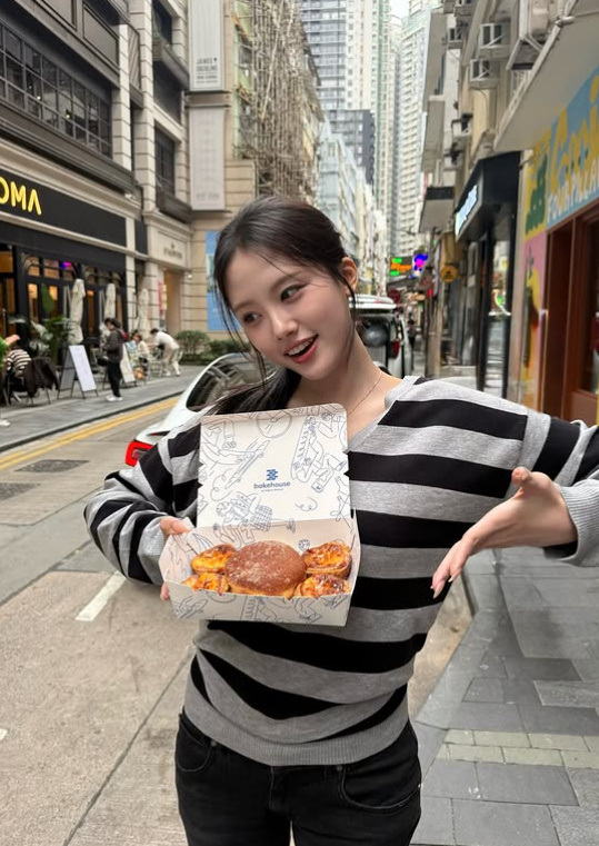 또 다른 사진에서는 베이커리 박스를 들고 장난기 어린 포즈를 취하거나, 카메라를 직접 들여다보는 모습으로 일상 속 자연스러운 순간을 담아냈다.
