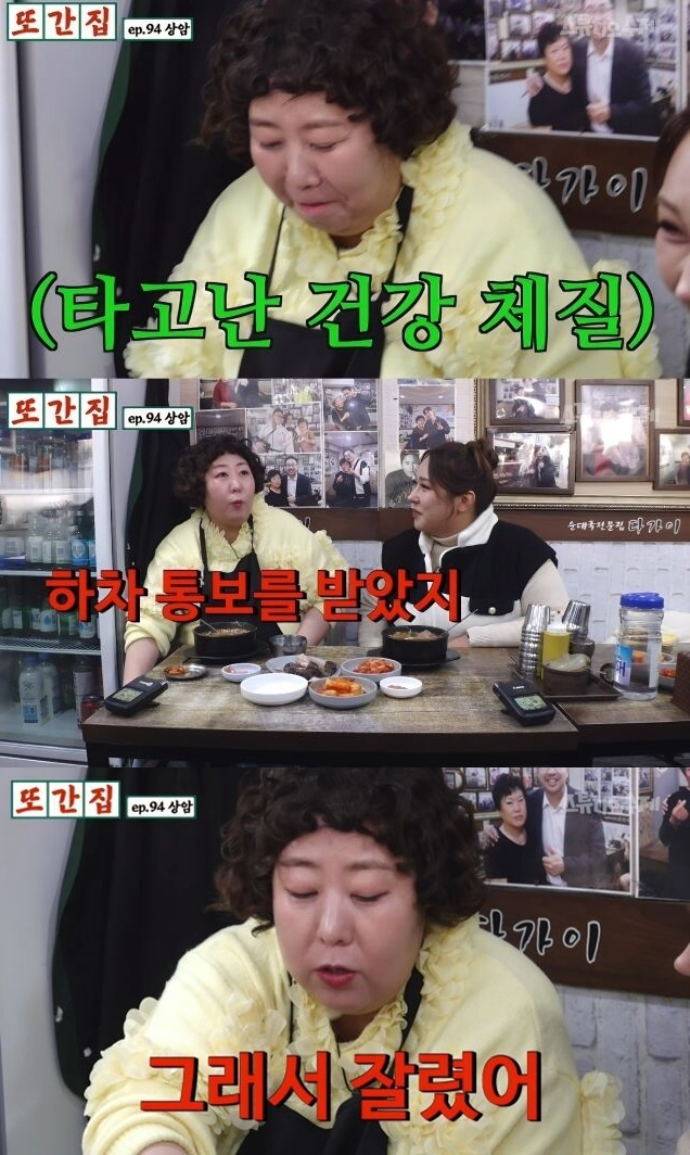 신기루는 “‘지방과의 전쟁’ 편에서 신애라 언니가 병아리콩 등 우리한테 뭘 해주고 혈당 체크를 했다. 내가 그 언니보다 낮게 나왔다. 그래서 하차 통보를 받았다”고 고백했다.