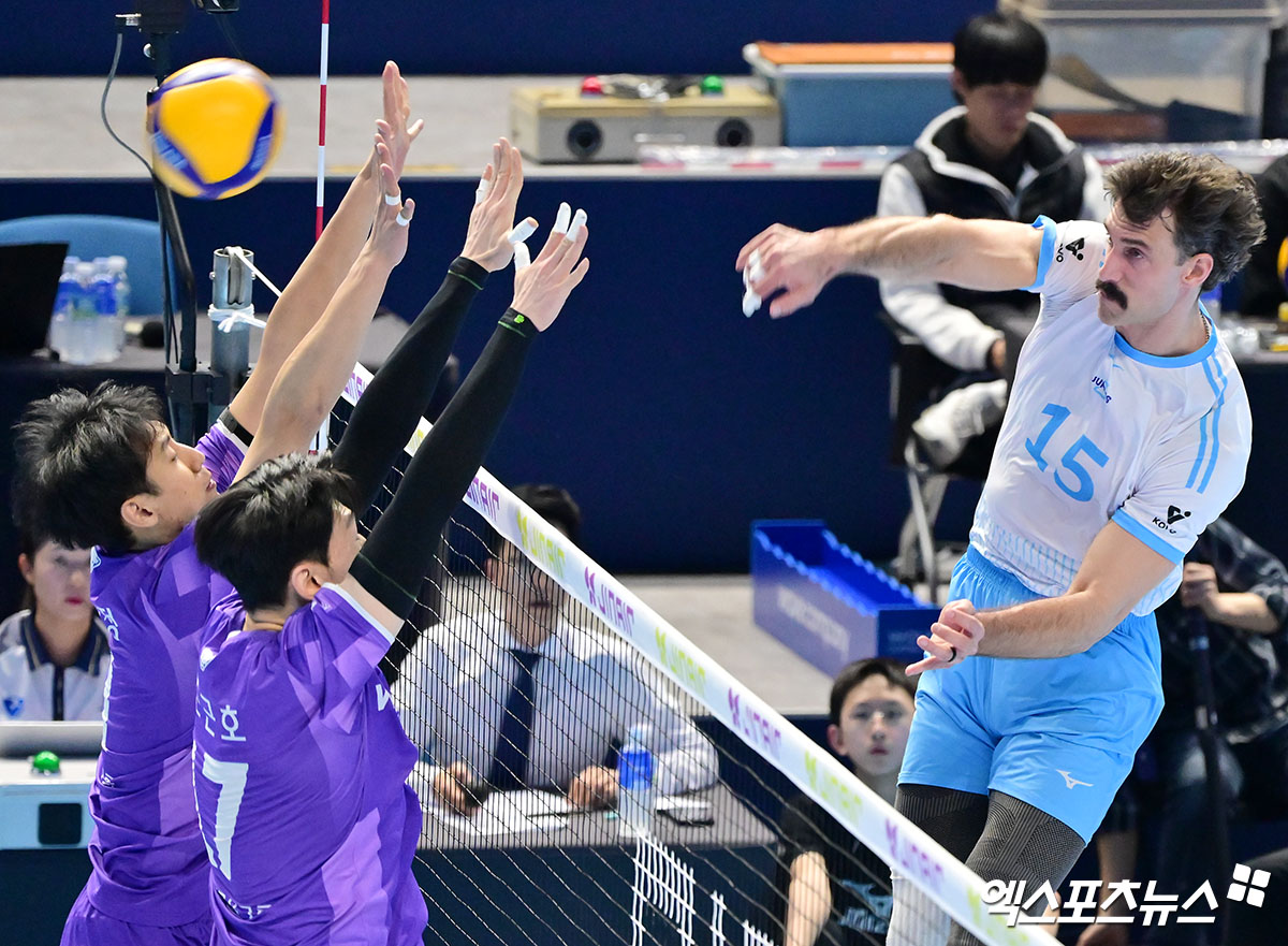 (엑스포츠뉴스 인천, 김한준 기자) 10일 오후 인천 계양체육관에서 열린 '진에어 2025-2026 V-리그' 대한항공과 우리카드의 경기, 대한항공 러셀이 공격을 시도하고 있다.