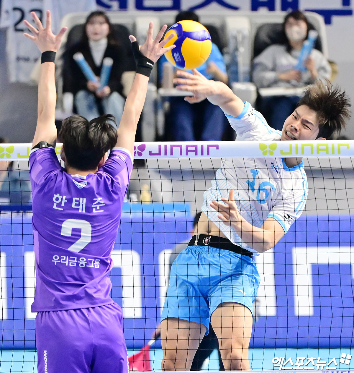 (엑스포츠뉴스 인천, 김한준 기자) 10일 오후 인천 계양체육관에서 열린 '진에어 2025-2026 V-리그' 대한항공과 우리카드의 경기, 대한항공 정한용이 공격을 시도하고 있다.